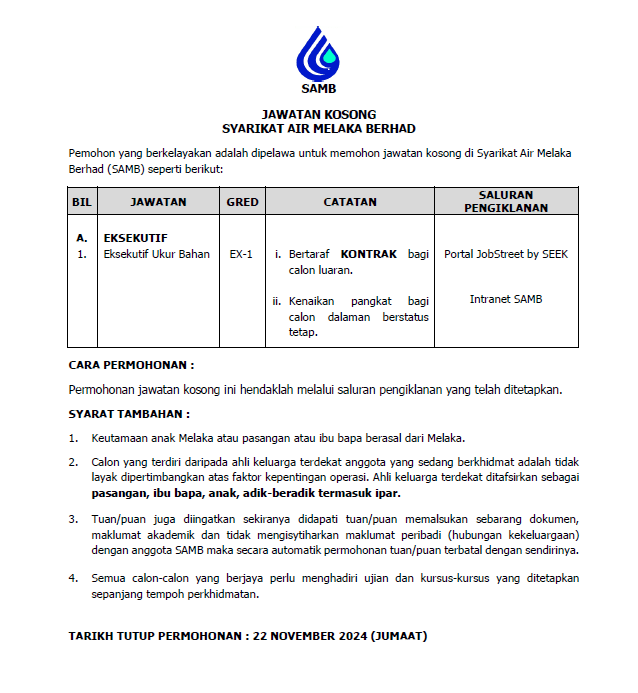 Syarikat Air Melaka Berhad sedang mengiklankan jawatan Eksekutif Ukur Bahan iaitu kenaikan pangkat bagi calon dalaman berstatus tetap bermula 12 November 2024 hingga 22 November 2024.