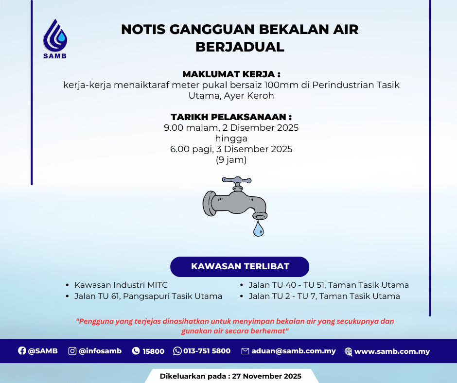 Notis-intranetNotisBerjadual Makluman Notis Gangguan Bekalan Air Berjadual di kawasan Ayer Keroh pada 2 Disember 2025.