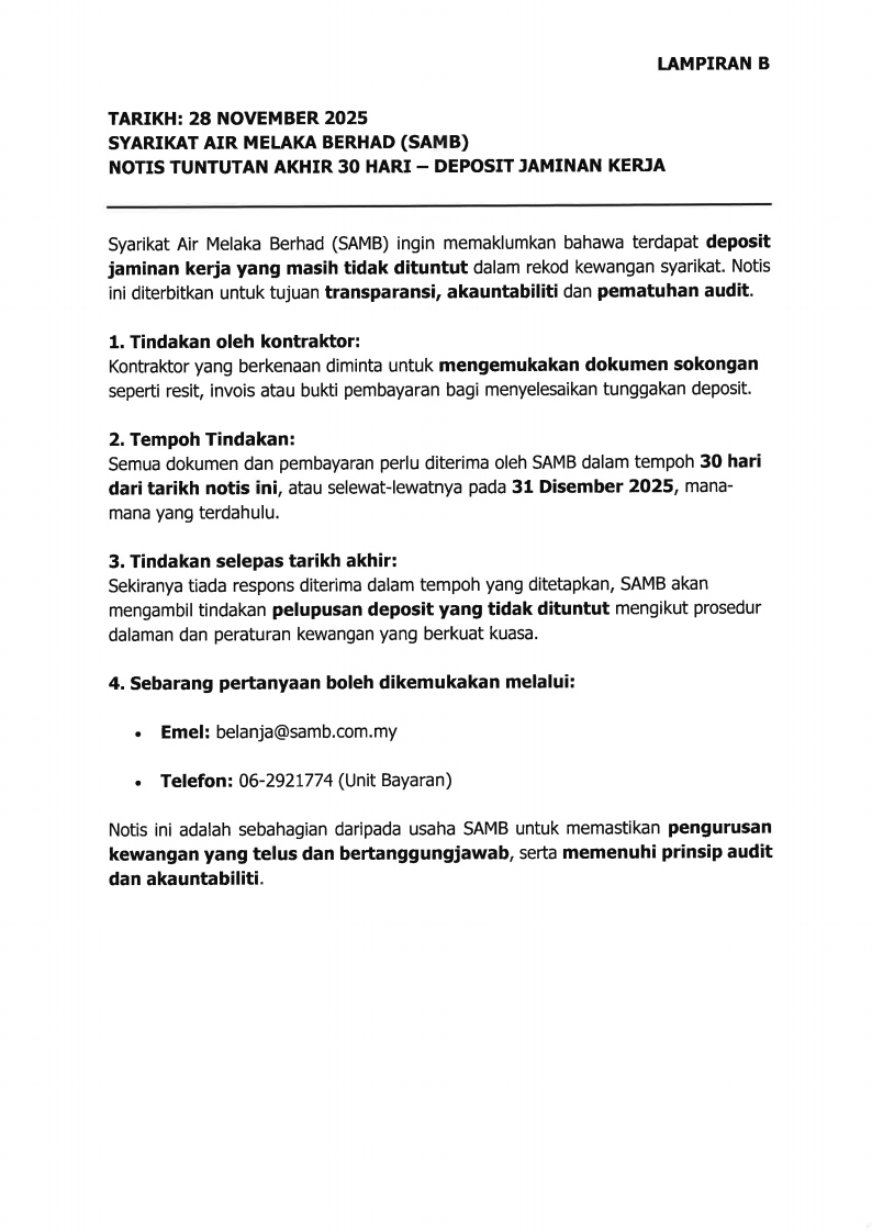 Makluman Notis Gangguan Bekalan Air Berjadual di kawasan Jalan Sekolah Ghafar Baba, Masjid Tanah pada 10 Disember 2025.